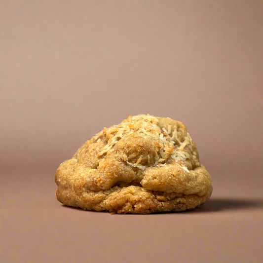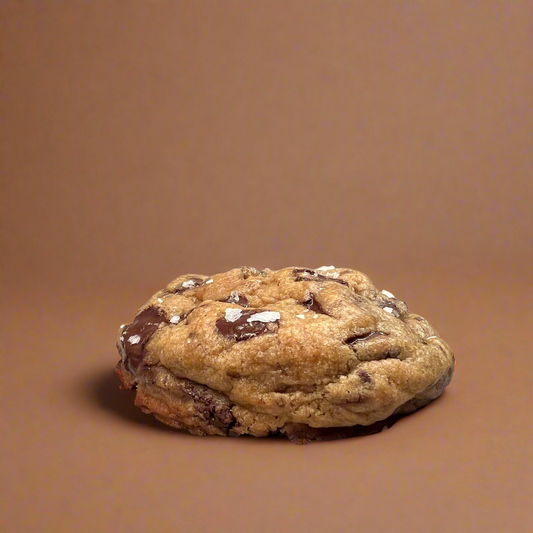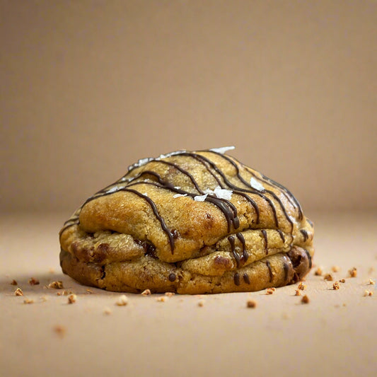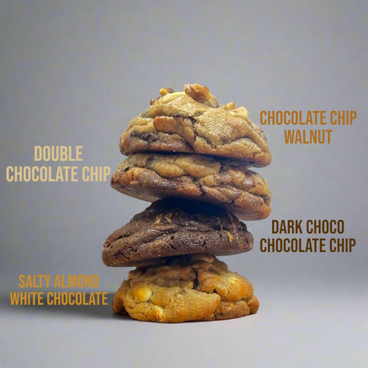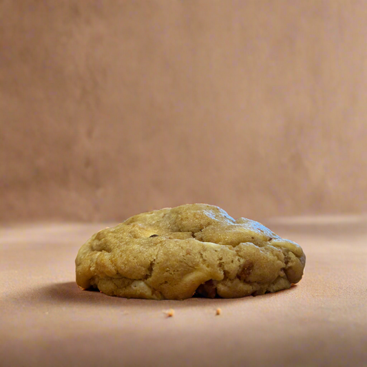 Vår Saffron Almond White Choco Cookie med juliga toner av saffran, krispiga mandelbitar och belgisk vit choklad. Den bjuder på en gyllene, lätt knaprig yta och ett fantastiskt mjukt center där den aromatiska saffranen möter söt vit choklad och rostad mandel i perfekt balans.