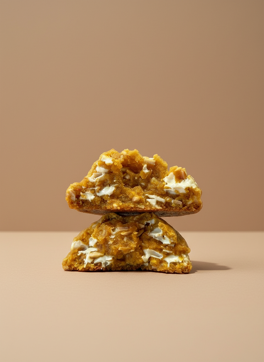 Vår Saffron Almond White Choco Cookie med juliga toner av saffran, krispiga mandelbitar och belgisk vit choklad. Den bjuder på en gyllene, lätt knaprig yta och ett fantastiskt mjukt center där den aromatiska saffranen möter söt vit choklad och rostad mandel i perfekt balans.