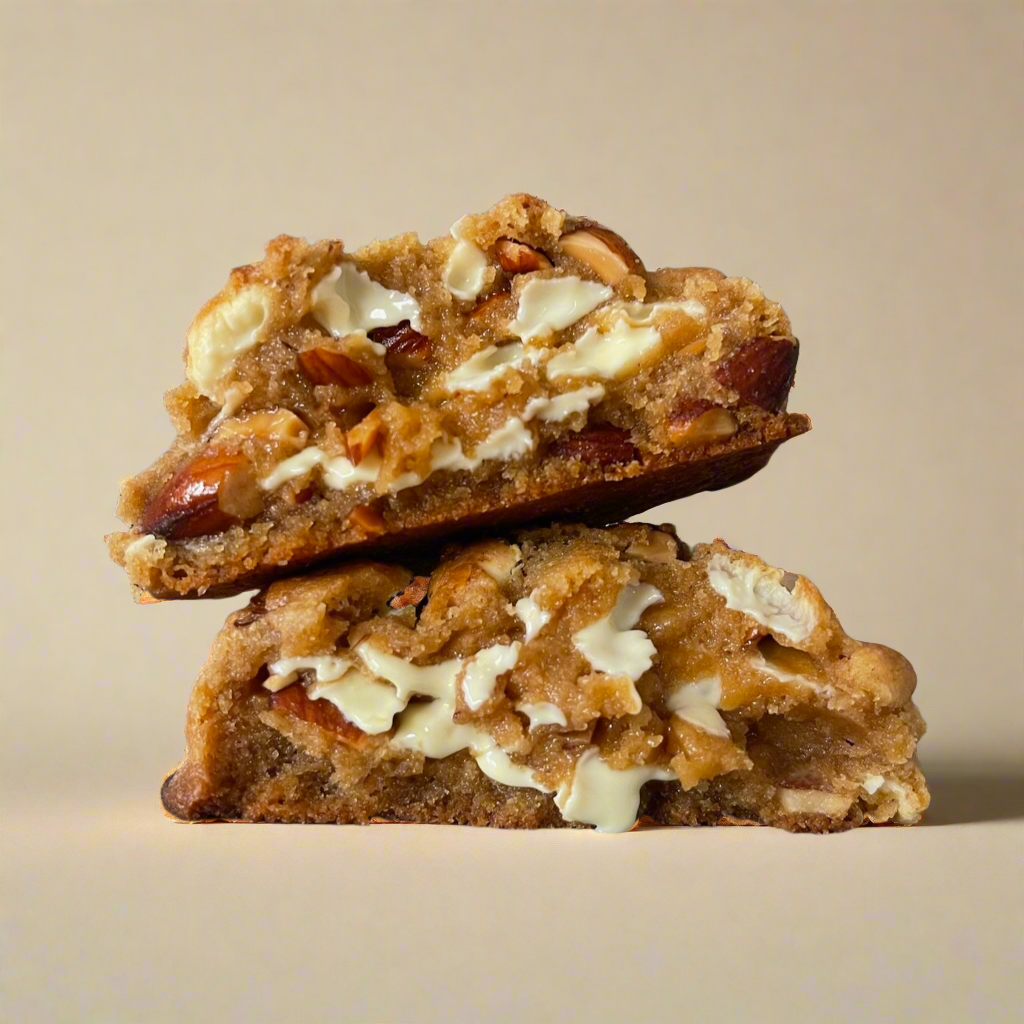 Denna cookie har en blandning av salta mandlar och belgisk vit choklad som tillsammans skapar den perfekta blandningen mellan crunchy, sött och salt!