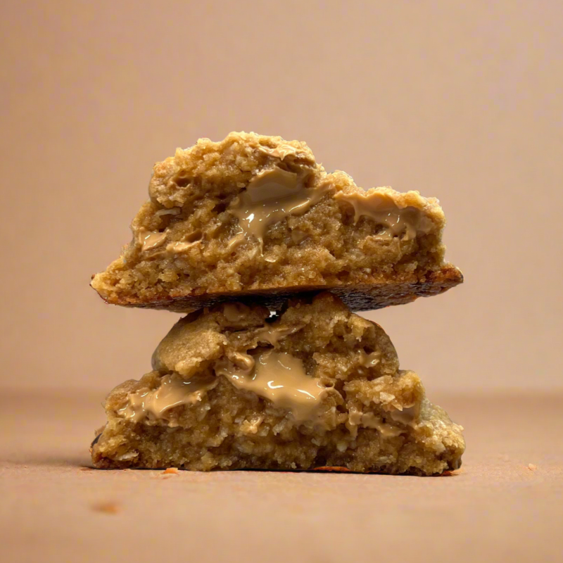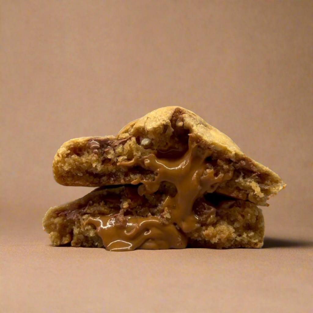 Dulce de Leche Cookie är en lyxig cookie bakad på en ljus cookiedeg fylld med belgisk vit choklad, krossade digestivekex och med ett center av rinnig Dulce de leche.