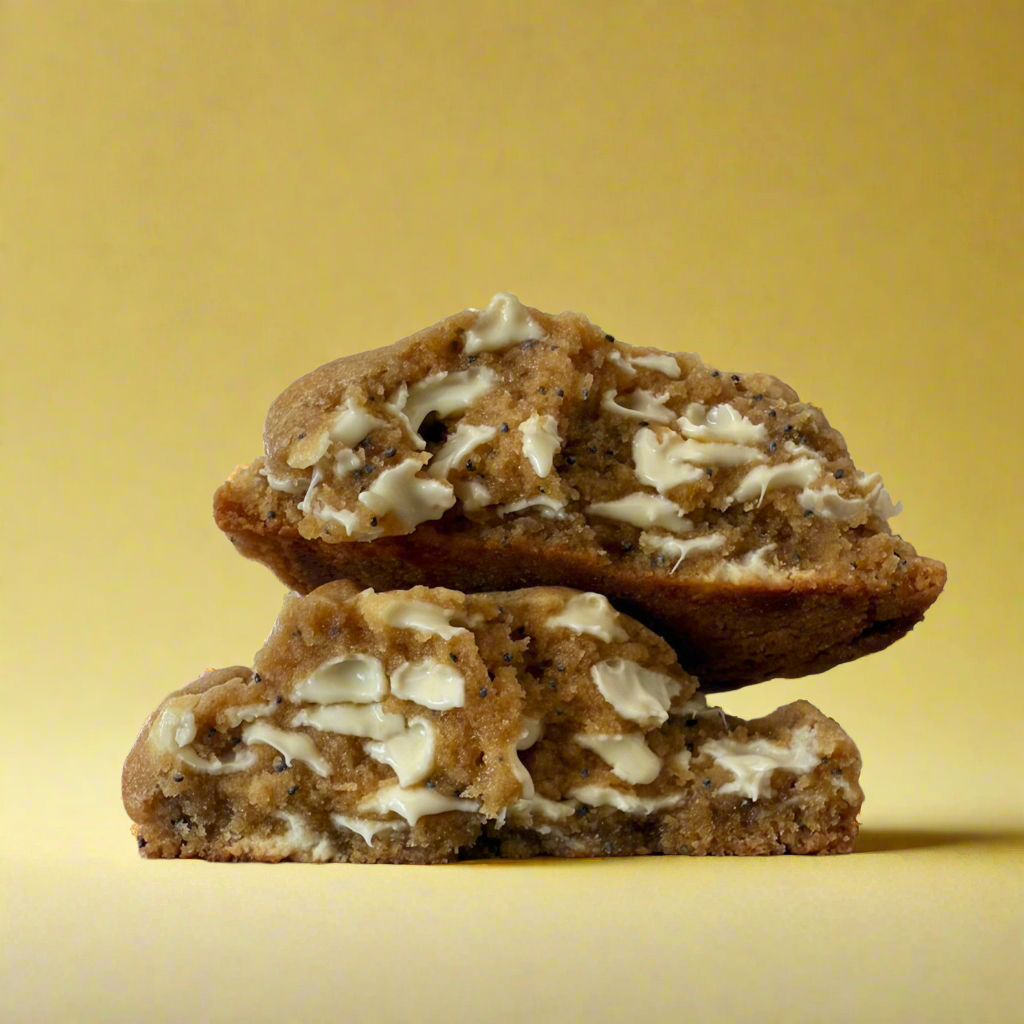 Vår Lemon Poppy cookie! Fylld med belgisk vit choklad, rivet citronskal, färskpressad citronsaft och valmofrön. En fräsch och somrig cookie med syrlig citrus.
