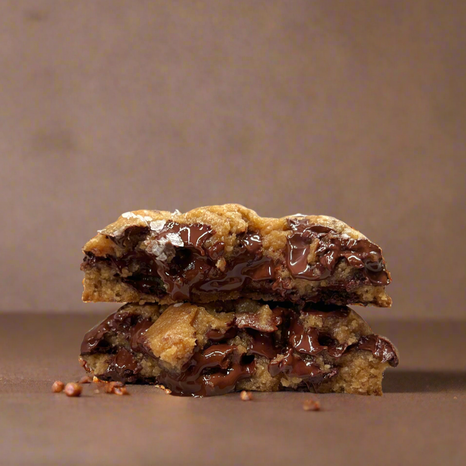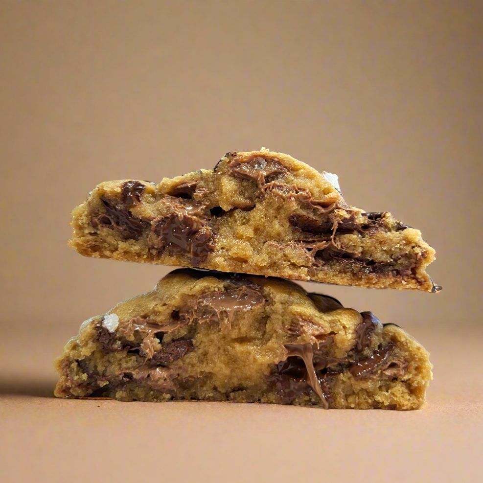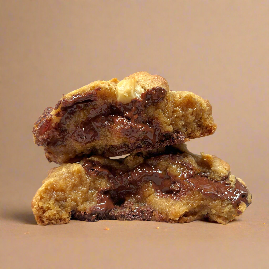 Vår veganska variant av en klassisk NYC style Chocolate Chip Cookie. En cookie fylld med belgisk mörk choklad.