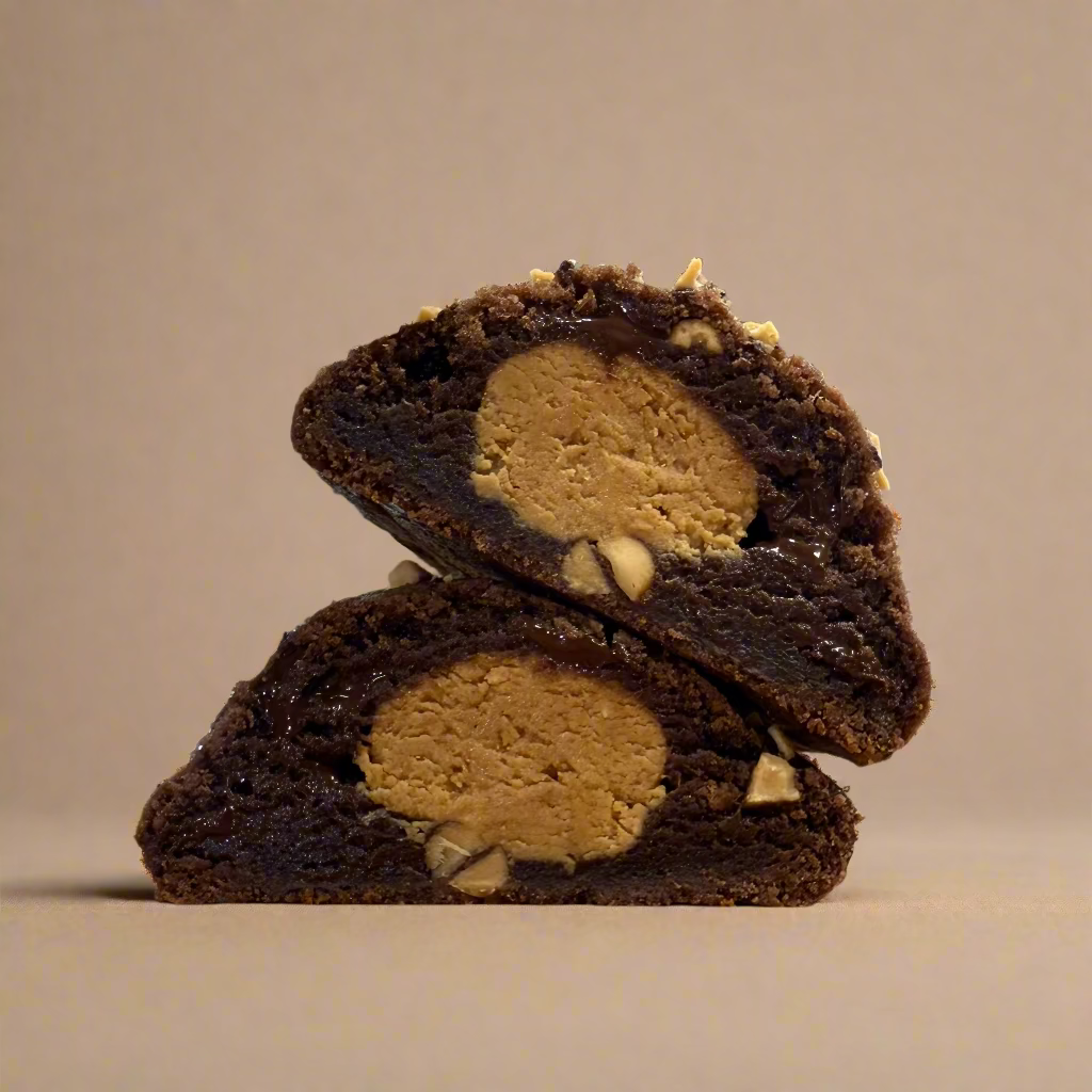Vår Peanut Butter Cup Cookie är en lyxig cookie bakad på en chokladig cookiedeg fylld med salta jordnötter, belgisk mörk choklad och med ett center av jordnötssmör.