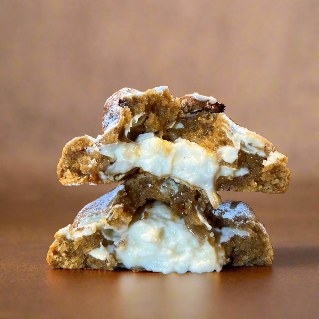Gingerbread White Chocolate Cookie med en juligt smaksatt deg, bitar av pepparkaka, belgisk vit choklad och med en fyllning av cheesecake cream cheese.