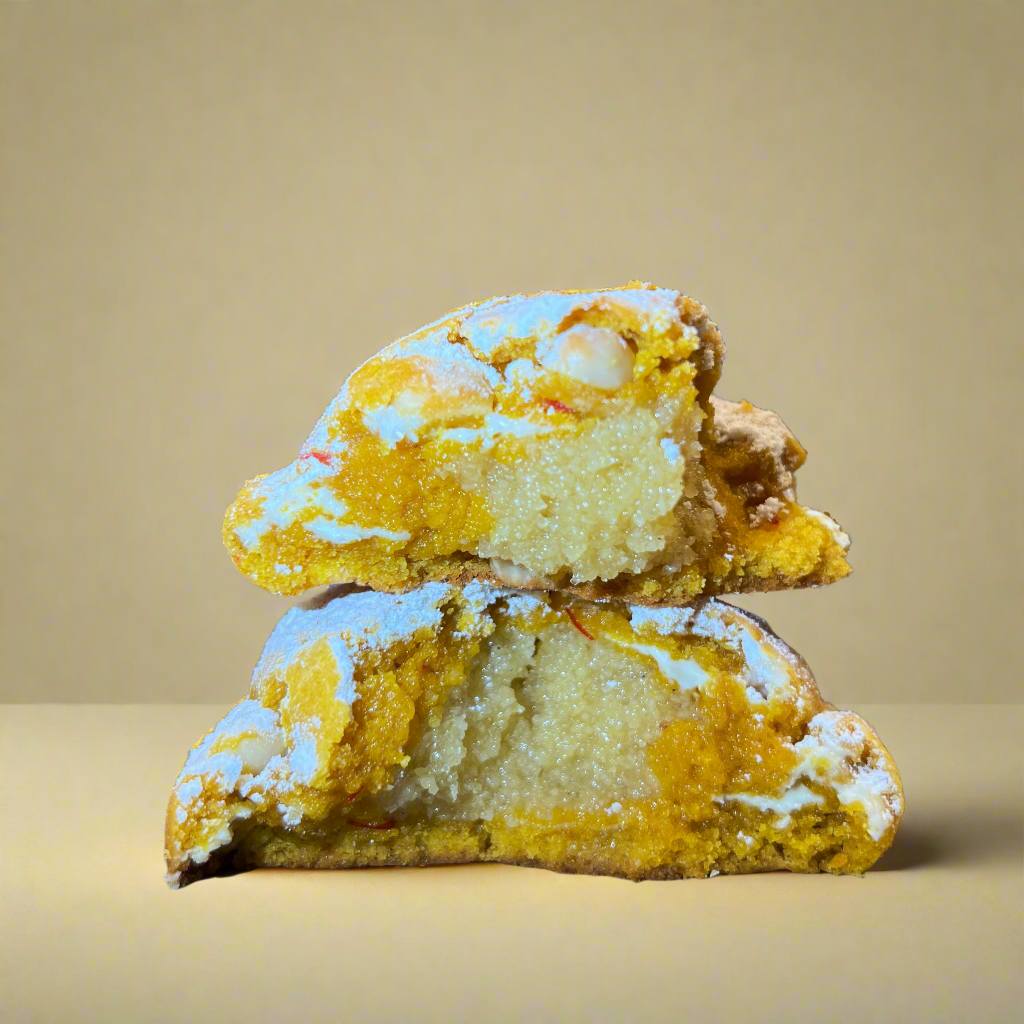 Vår egna saffranscookie - fylld med belgisk vit choklad och med ett center av mandelfyllning blir varje tugga av denna cookie en härlig juldröm.