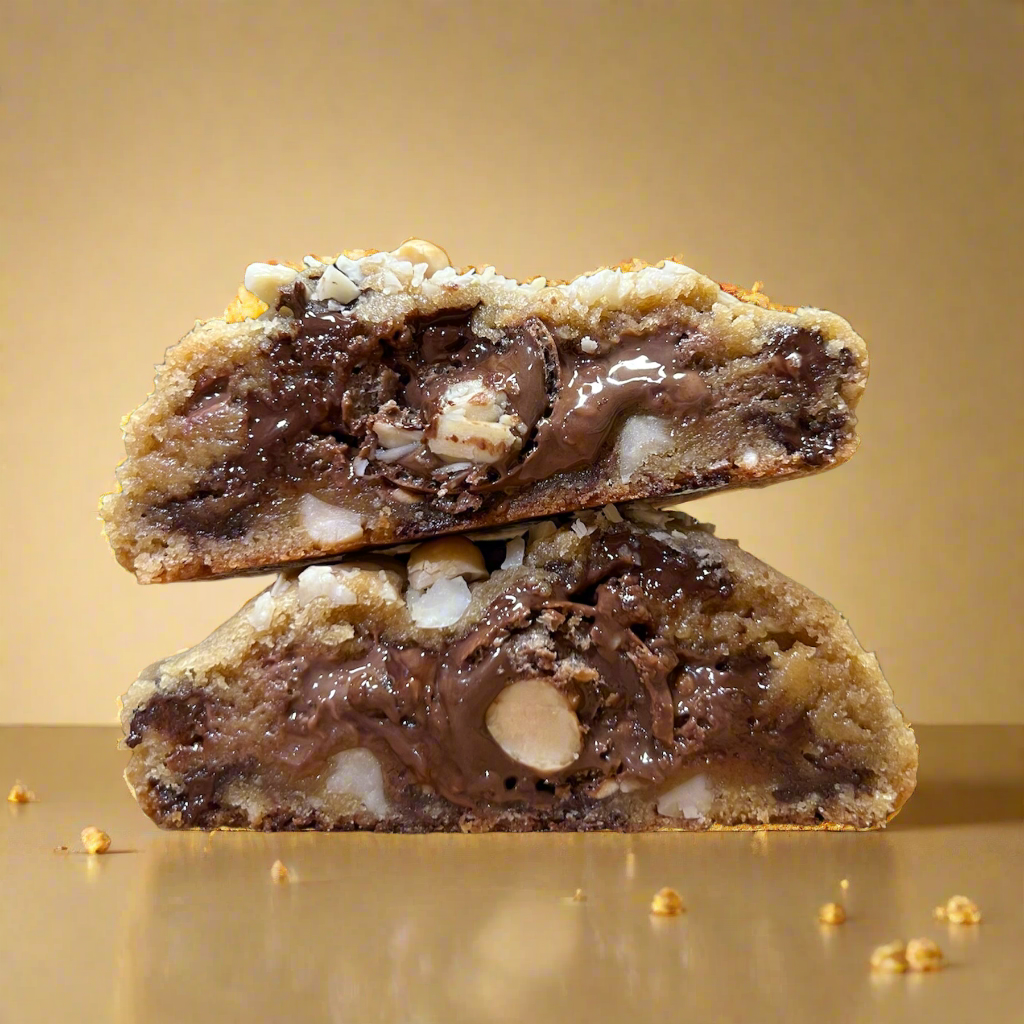 Vår egna Ferrero Rocher cookie! En lyxig kaka fylld med en hel Ferrero Rocher®, Nutella®, belgisk mörk- och mjölkchoklad samt bitar av krossade och rostade hasselnötter.