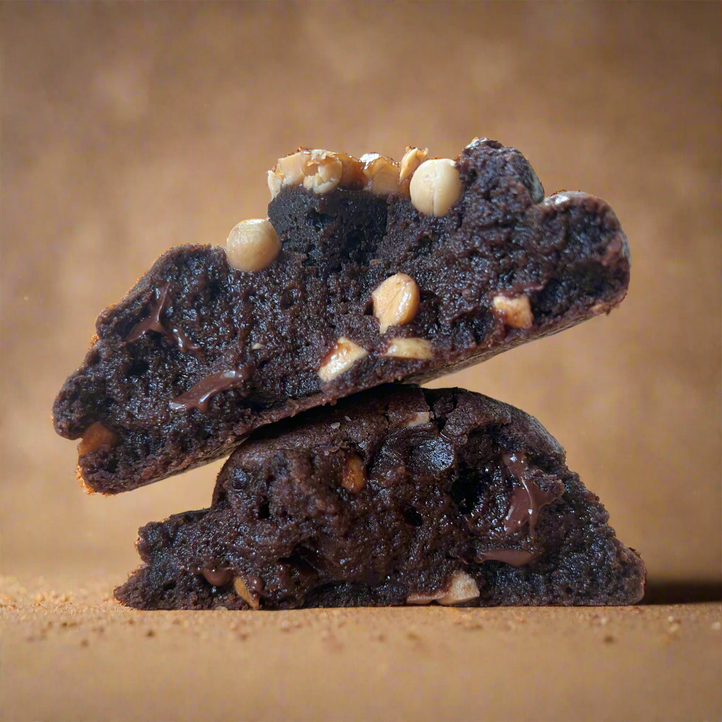 Vår Peanut Brownie cookie, fylld med belgisk mörk choklad, rostade jordnötter och bitar av chokladbrownie.